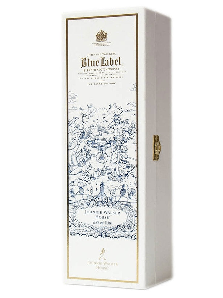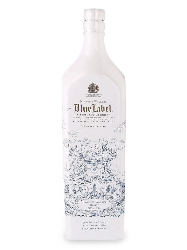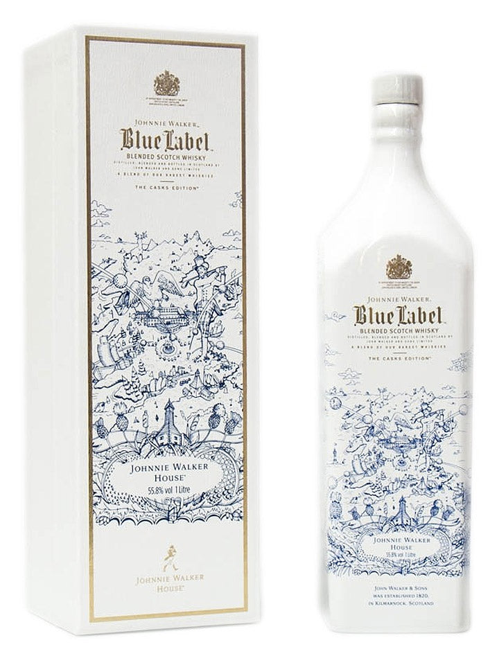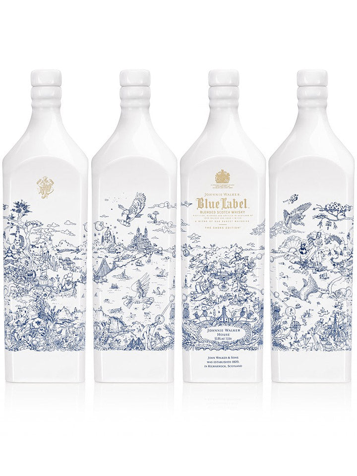 Created in collaboration with illustrators Good Wives and Warriors, the whimsical design depicts a "modern traveller's dreamscape", the detailed design has been etched in blue under-glaze on a porcelain bottle in the signature Johnnie Walker square shape.
